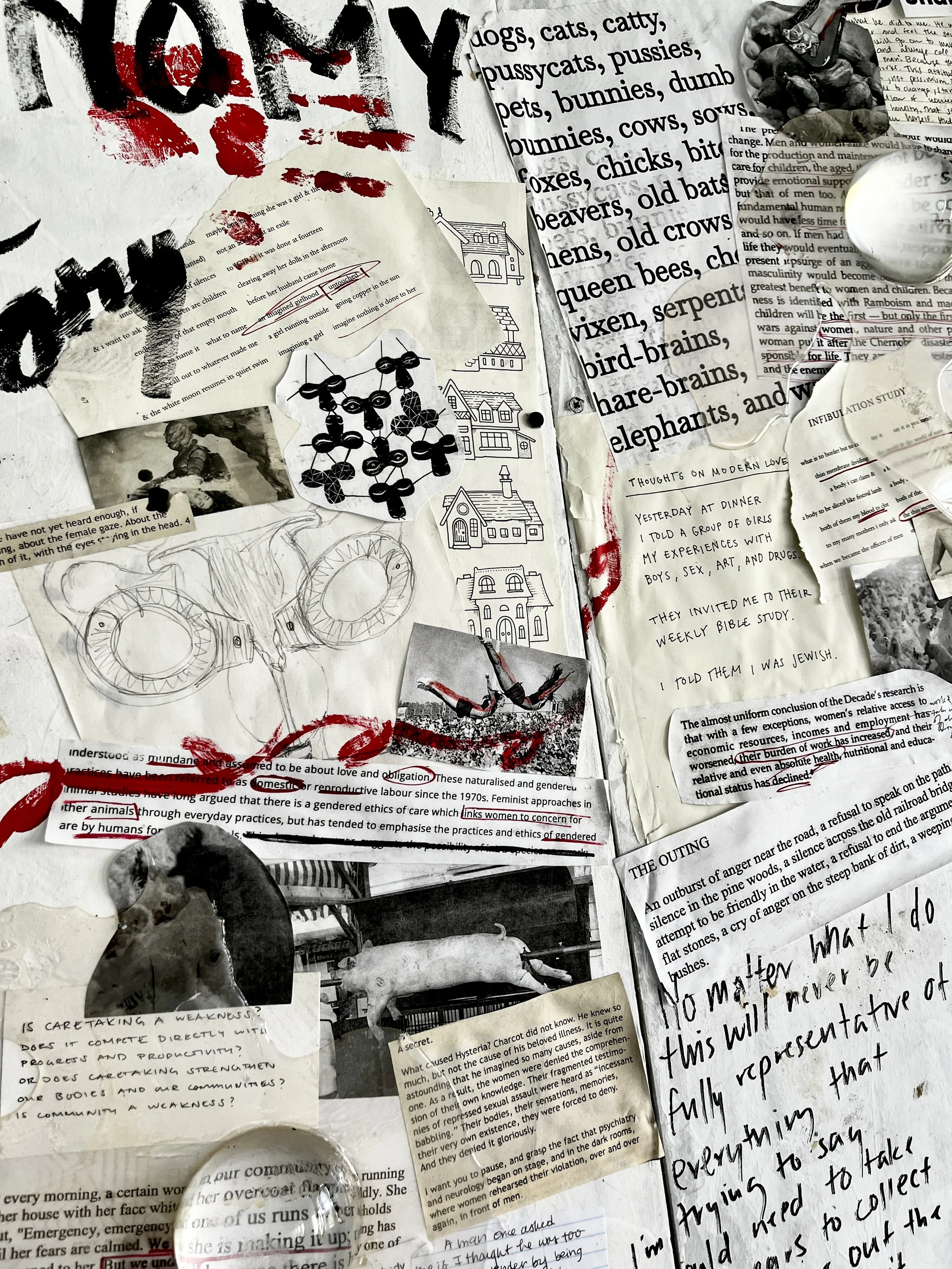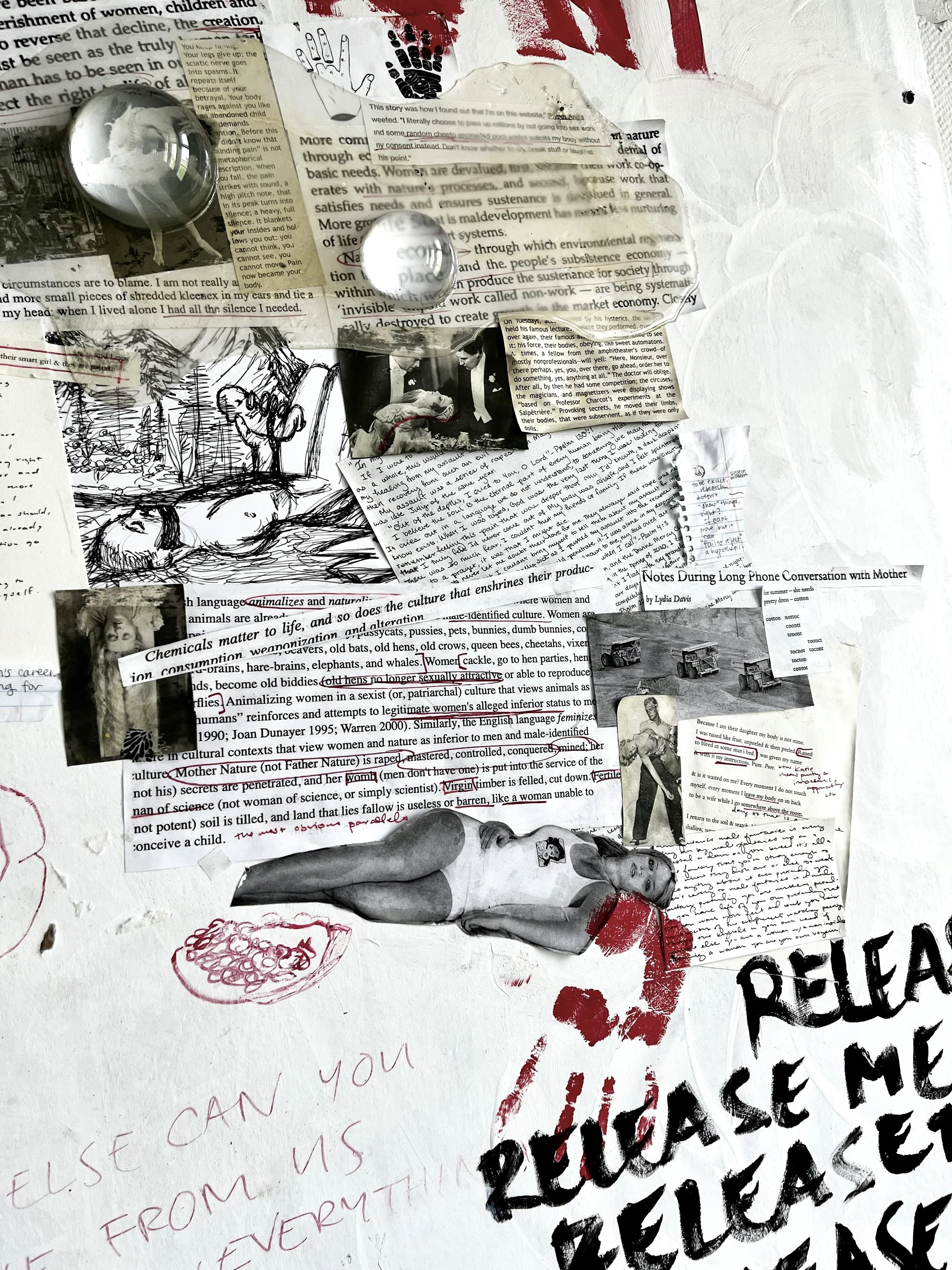 Through an assemblage of handwritten accounts, academic papers, poems, news articles, short stories, and images, which knives are for the animals | which ones are for the girls? prompts viewers to examine and engage with the complex underpinnings of feminine subjectivity. Formless casts of resin and scattered magnifying lenses amplify and obscure the concurrent violence of sexism, colonialism, and industrialization, revealing their shared intersection in aggressive masculinity and domination over women and nature. A cathartic collision between internal conflict and external circumstances, this piece invites an intimate, vulnerable conversation about the objectification of feminine persons and the environment across our material worlds, political regimes, and cultural imaginations.